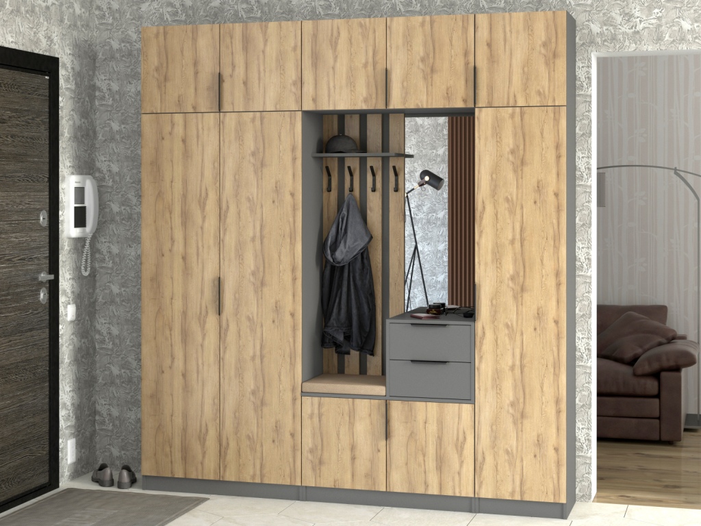 Во вкладке "Выбрать модули" Вы можете подобрать различные по комплектации шкафы, вешалки, угловой элемент. Модульная система поможет подобрать вам необходимые модули, с учетом размеров помещения, планировки.